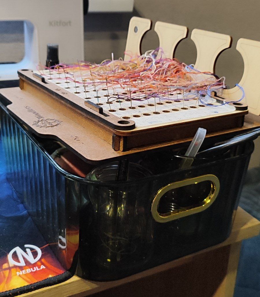 Организация процессов и запасов для меня очень больная тема. Отдельного уголка у меня нет, так что вышиваю, шью и работаю я за одним столом. У меня просто волшебное кресло, в котором спина себя чувствует комфортно. Большой проблемой для меня было собрать все сопутствующие инструменты в какой-то одной локации. Поэтому они постоянно путешествовали по всему столу. Но потом простой поход в отдел товаров для дома все решил. Сейчас у меня есть процессный ящичек, с которым очень удобно путешествовать от стола к дивану и обратно. Вот так в нем разместилась парковушка с ниточками для "Геймера". Это она в состоянии покоя. При работе я ее ставлю на стол. Внутри только самое необходимое и не очень самое. Мне важно, чтобы в зоне досягаемости был крем для рук. От работы и вышивки они очень сохнут. Сейчас у меня не самый лучший продукт. Он очень долго впитывается. Все пытаюсь обзавестись лосьоном для вышивальщиц, но вечно не успеваю его застолбить. Он очень быстро разлетается в группе с закупками.