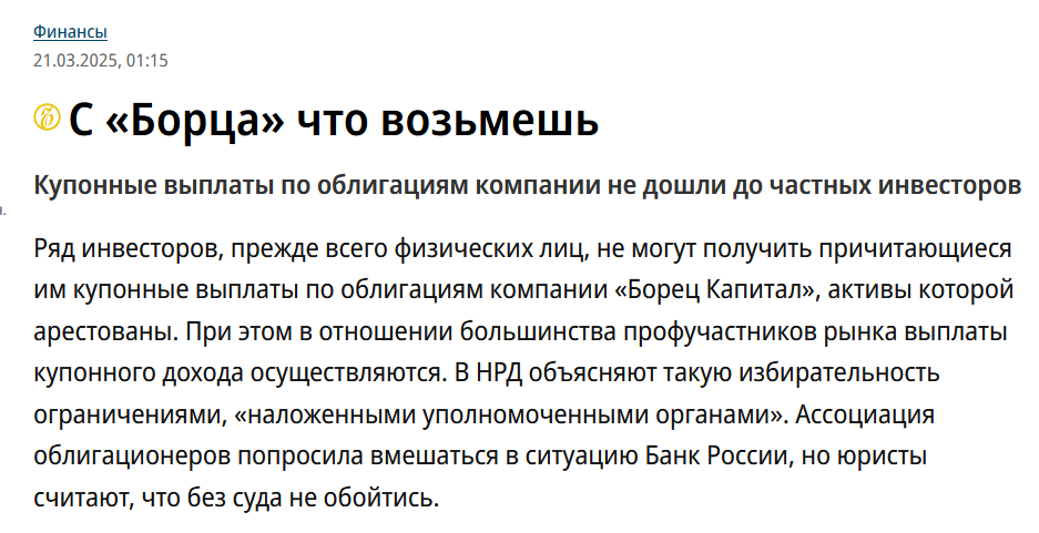 И невыплата держателям облигаций Борец Капитал, физическим лицам, купонов. При этом профессиональные участники фондового рынка деньги получили.