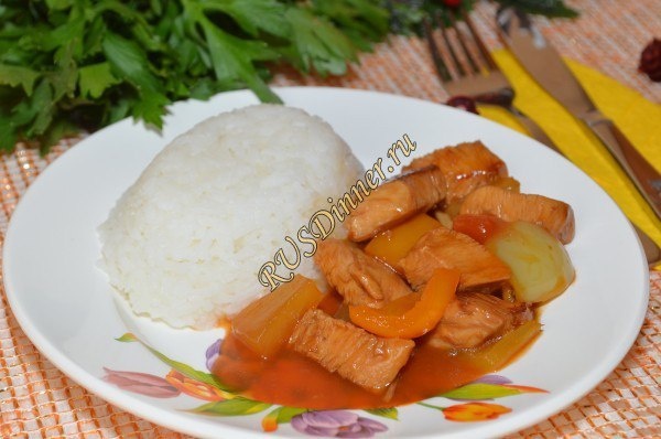 Курица в кисло-сладком соусе с ананасами Ингредиенты: Куриная грудка - 400 гр. Перец болгарский - 300 гр. Помидоры - 120 гр. Имбирь корень - 30 гр. Ананас консервированный - 1 б. (580мл) Томатная паста - 30 мл. (1 ст.л.) Соус соевый - 80 мл. (4 ст.л.) Крахмал картофельный - 60 гр. (2 ст.л.) Уксус яблочный - 70 мл. (4 ст.л.) Мука - 25 гр. (1 ст.л.) Масло растительное - 30 мл. Для маринада: Соус соевый - 50 мл. Источник: https://rusdinner.ru/page/kurica-v-kislo-sladkom-souse-s-ananasami
