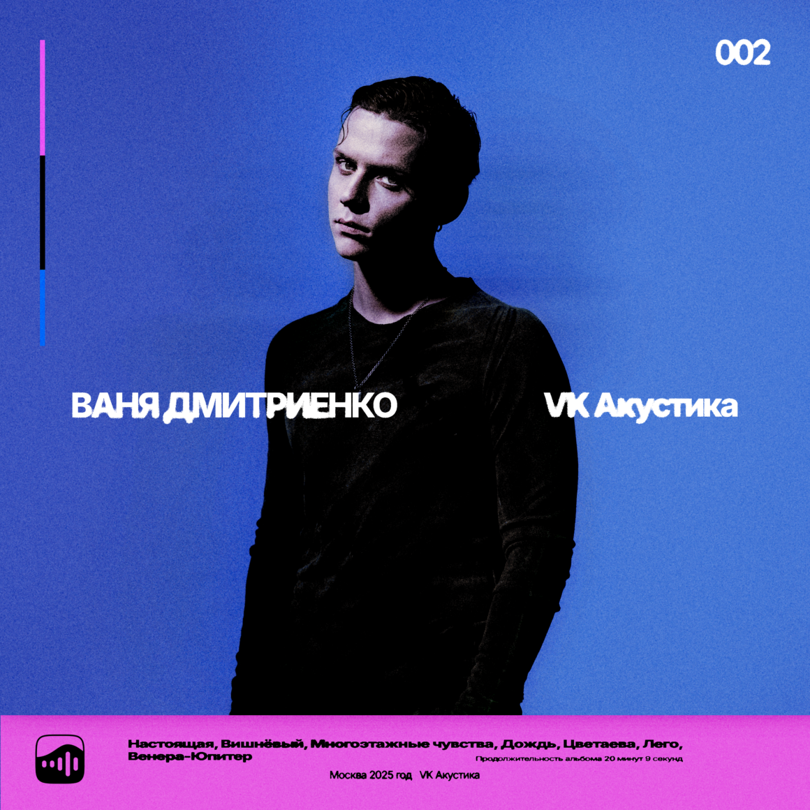 Ваня Дмитриенко совместно с VK Музыкой дропнул альбом в рамках проекта VK Акустика. Хитовые треки артиста получили новое акустическое прочтение с нотами любовной лирики. Альбом доступен на всех стриминговых площадках. Всего на альбоме 7 треков. Особенно нежной и романтичной получилась новая песня «Настоящая», которую сам артист считает фокусной: «Если раньше «Настоящая» была очень брутальной и сексуальной, несмотря на её безумную чувственность, то сейчас она стала более лиричной, трогательной и живой. Вся VK Акустика — 100% новая ступень в музыке. Это и взросление меня как артиста, и уважение к аудитории, которая любит моё творчество в акустике. Поэтому нам очень хотелось, чтобы этот альбом звучал по-настоящему», — говорит Ваня Дмитриенко. В акустике треки Вани полностью раскрывают потенциал его лирического героя, чья музыка лечит на любом жизненном этапе и помогает по-разному слышать смыслы в ранее известных композициях. Треклист альбома VK Акустика: В июне состоится премьера клипа «Н