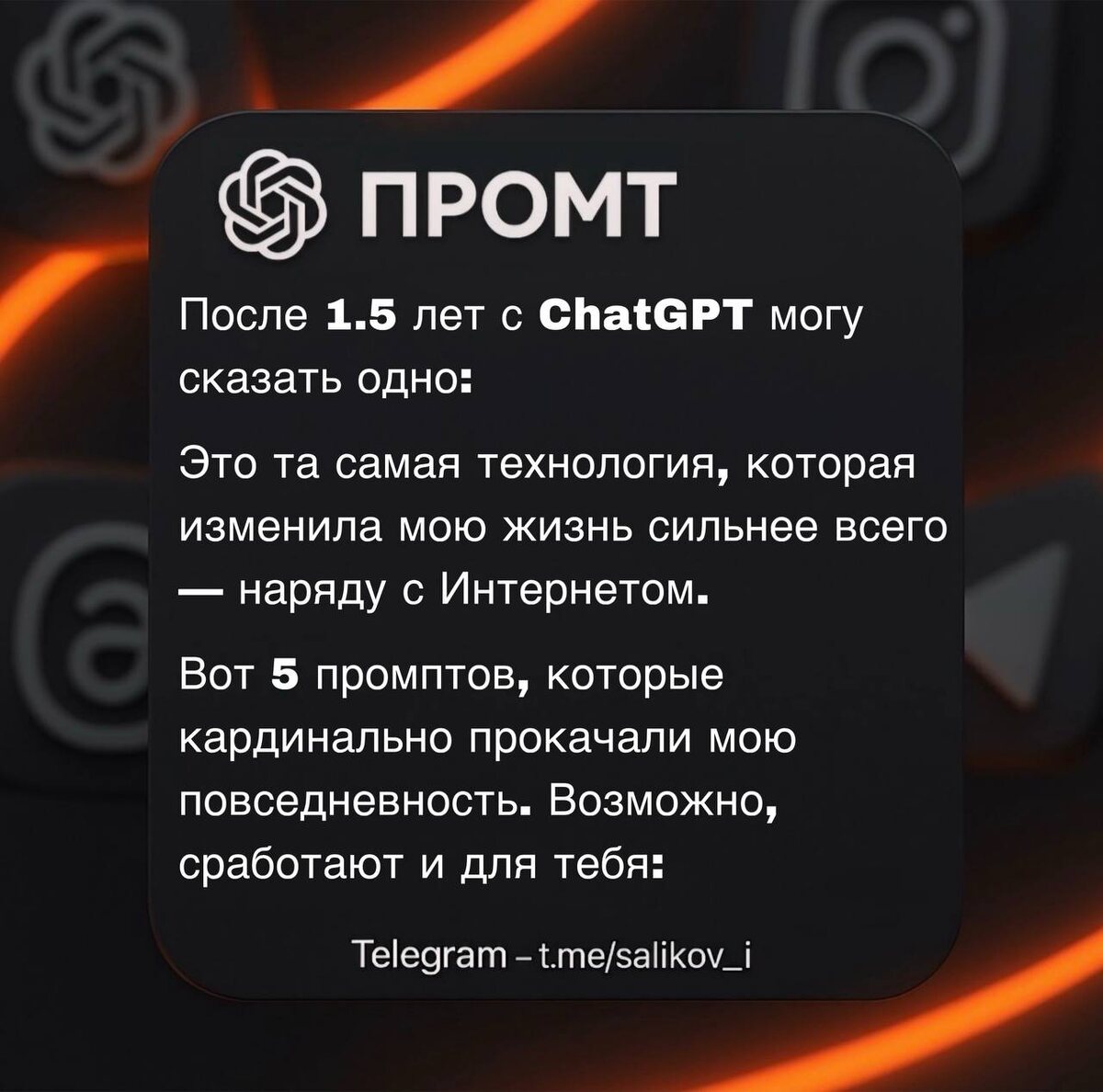 После 1.5 лет с ChatGPT могу сказать одно: Это та самая технология, которая изменила мою жизнь сильнее всего — наряду с Интернетом. Вот 5 промптов, которые кардинально прокачали мою повседневность. Возможно, сработают и для тебя: ⸻ 1. План полной перезагрузки жизни 🧠Промпт: «Представь, что ты — топовый лайф-коуч. Сейчас я сталкиваюсь с проблемой: [вставь свою боль]. Помоги мне составить персональный план на 30 дней, чтобы решить это, улучшить [здоровье/деньги/фокус] и приблизиться к жизни мечты, которая выглядит так: [кратко опиши свою идеальную жизнь].» ⸻ 2. Освой любой навык за 30 дней 🔄Промпт: «Выступай в роли эксперта-ментора. Я хочу с нуля овладеть навыком [вставь любой навык] и дойти до продвинутого уровня за 30 дней. Разбей путь на ежедневные уроки, практику и реальные задачи. Убирай лишнее — только то, что даёт быстрый результат.» ⸻ 3. Система умножения денег 💸Промпт: «Представь, что ты — мой финансовый стратег. Сейчас я зарабатываю [вставь доход] и хочу выйти на