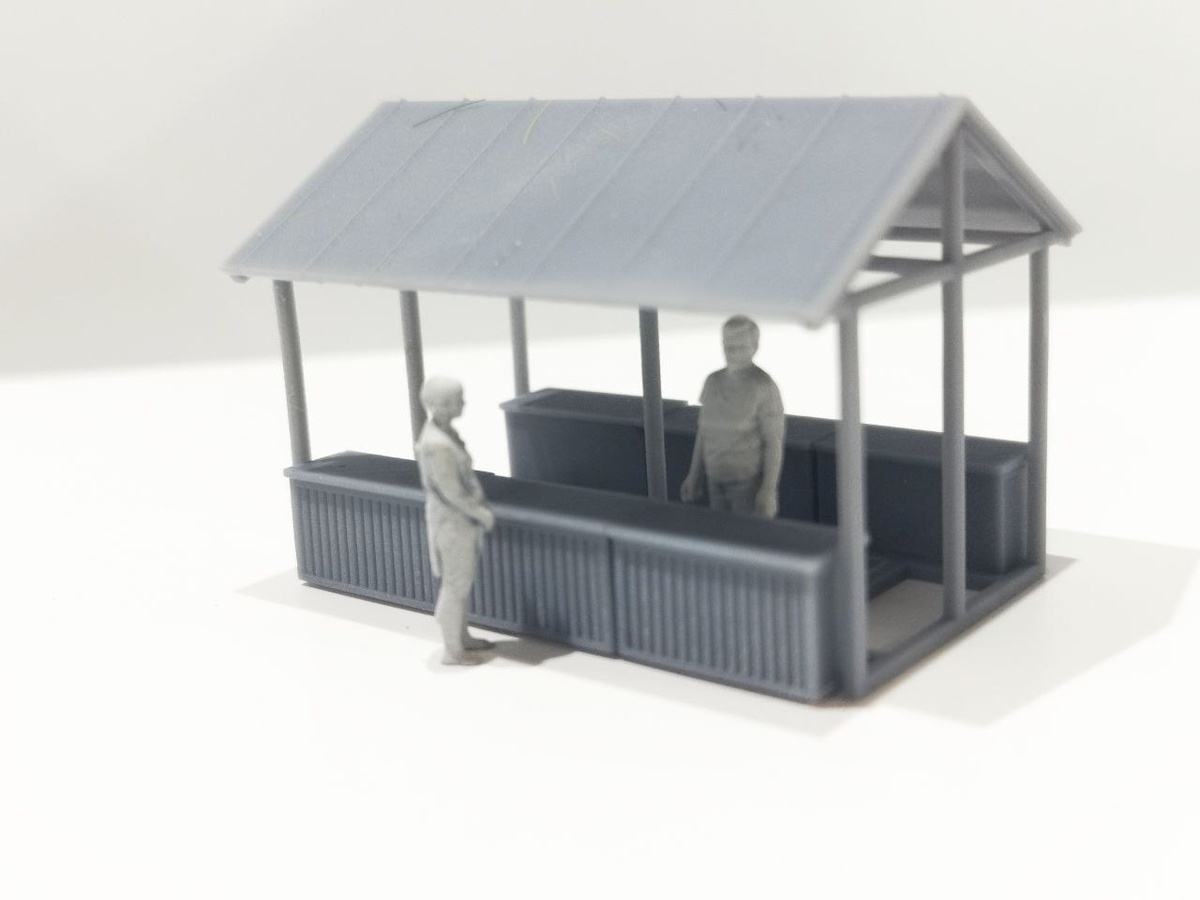 Мастерская "Макетно" представила набор для самостоятельной сборки модели открытого рыночного комплекса в масштабе 1:87. Подобные рынки, представляющие собой прилавки с навесами и крышами, есть, наверное в каждом большом и малом городе, в каждом селе. Различия могут быть в конструкции прилавком и их количестве, но в целом они весьма распространены в нашей стране повсеместно и очень давно. (Лично у меня они ассоциируются в первую очередь с байкальскими прибрежными поселками, а в голове так и звучат слова "рыба свежая: омуль, сиг, горячего, холодного копчения!") В подобном виде прилавки для уличной неорганизованной торговли используются практически в неизменном виде десятки, если не сотни, лет. Поэтому модели данных сооружений - весьма удачное решение для макетов и диорам, они подходят под любую тематику макета практически на любую эпоху. В масштабе 1:87 тематика отечественных зданий, строений и сооружений представлена по-прежнему слабо, но благодаря в том числе маркёрской "Макетно" акти