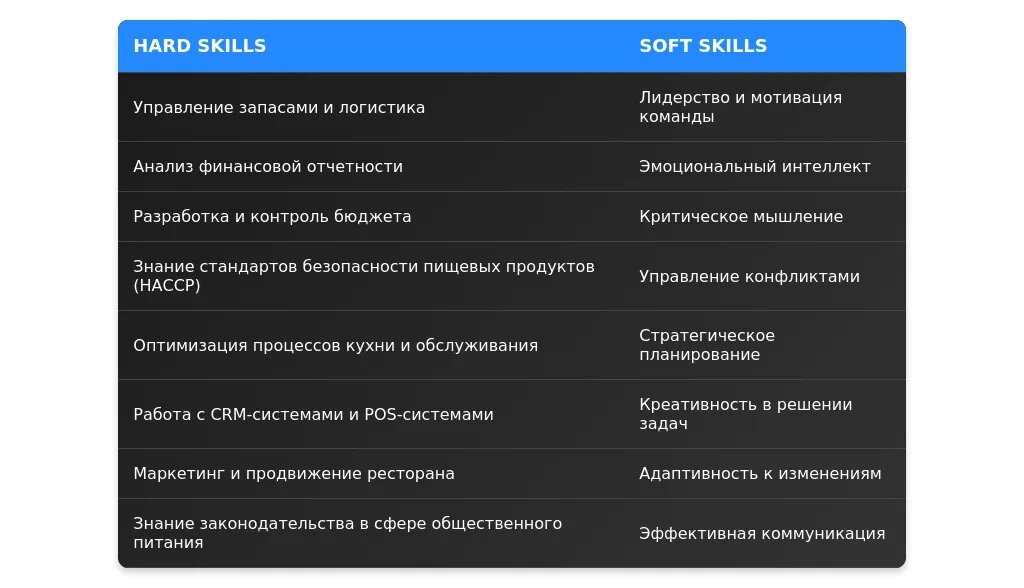 Начинающим директорам ресторанов стоит сделать акцент на обучаемости и базовых навыках. Примеры: