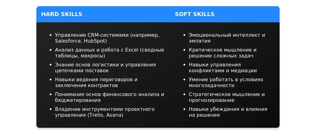 После: Навыки работы с CRM-системами (Salesforce, Bitrix24), ведение переговоров, управление закупками.