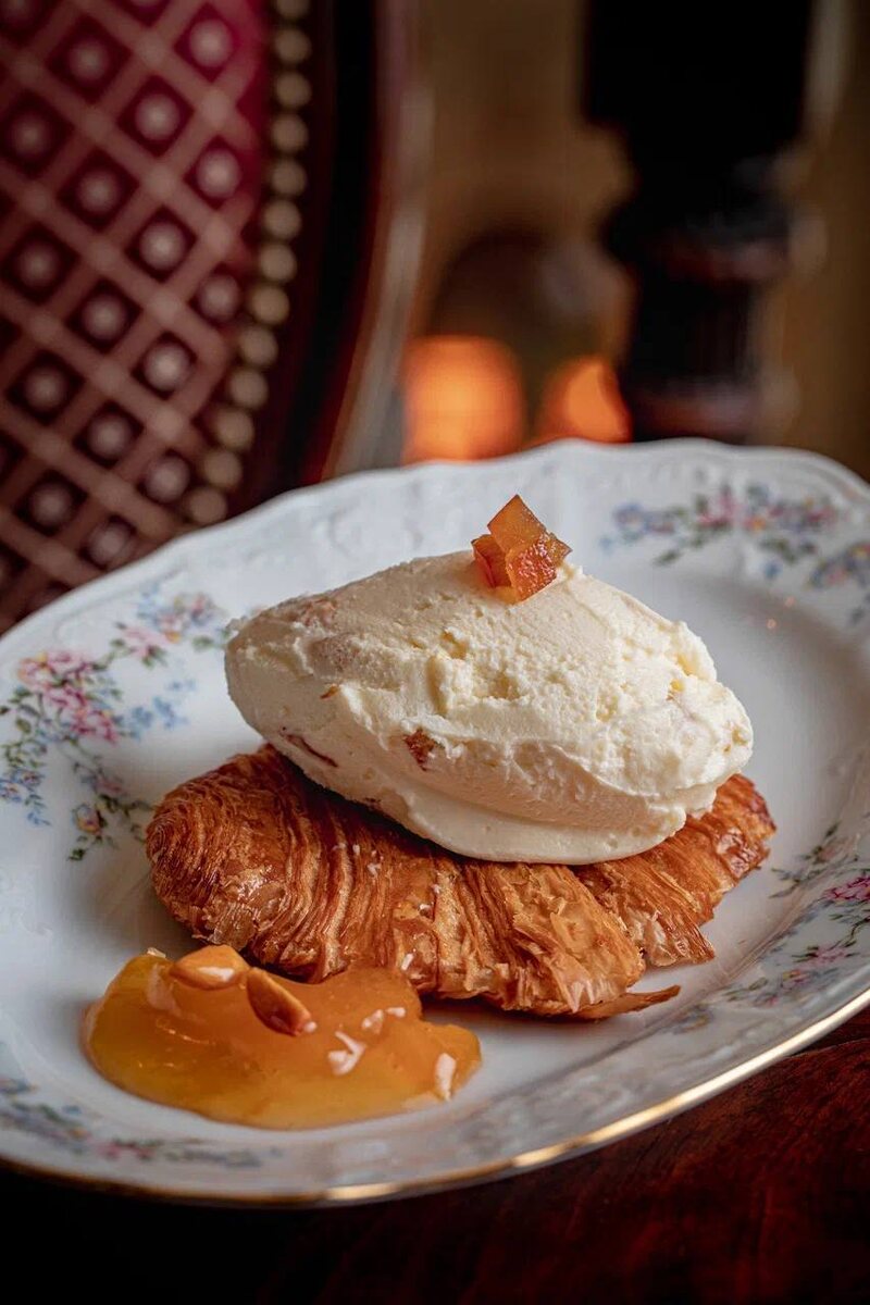 Нашли в обновленном меню завтраков «Кафе Пушкинъ» пряженый круассан на «русский манеръ», который жарится на масле, а не выпекается и пирожное с мороженым и горячим шоколадом.