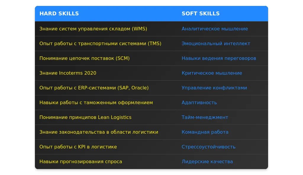- Технические навыки: логистическое программное обеспечение, CRM-системы, аналитика данных.