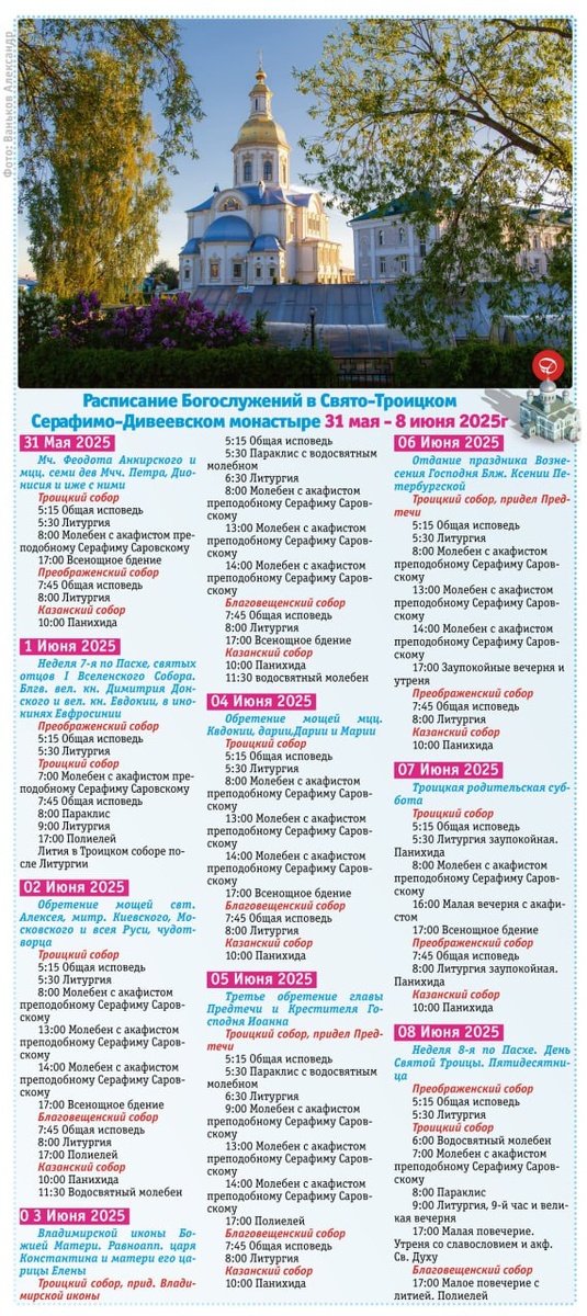 Расписание Богослужений в Свято-Троицком Серафимо-Дивеевском монастыре 31 мая - 8 июня 2025г.