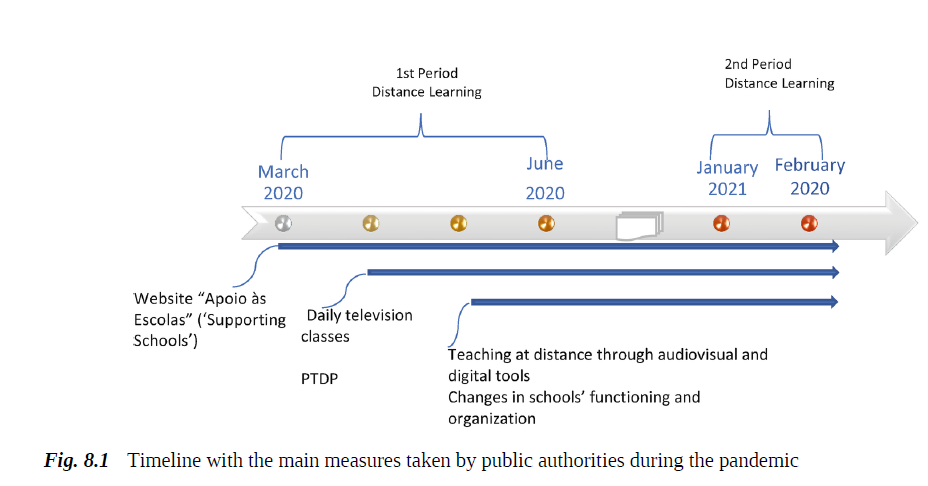 In the second period of interruption of face-to-face teaching (January–February 2021), the website continued to be expanded and improved, as well as the TV Program and the PTDP, which included two massive implementation phases of teacher training. Moreover, exceptional measures were implemented for the promotion and monitoring of apprenticeships, as well as the enhancement of the teaching and learning process, curriculum management, student tasks, and the recovery of learning losses (PORTUGAL, 2020). Figure 8.1 shows the timeline with the main measures by public authorities during these two periods.