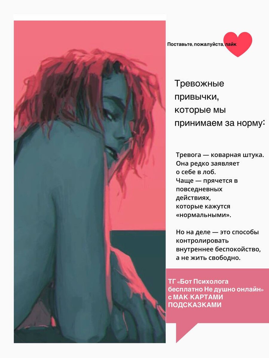 Тревожные привычки, которые мы принимаем за норму: Тревога — коварная штука. Она редко заявляет о себе в лоб. Чаще — прячется в повседневных действиях, которые кажутся «нормальными», «продуктивными» или «просто привычными». Но на деле — это способы контролировать внутреннее беспокойство, а не жить свободно. Поставьте, пожалуйста, лайк❤️ Примеры тревожных привычек: * Ты постоянно проверяешь телефон, даже когда никто не писал. Почему? Тело ищет разрядку. Мозг ищет «внешнюю гарантию», что всё в порядке, ты не пропустил что-то важное, тебя не отвергли. * Ты уходишь последним с работы, потому что «ещё не всё идеально». Почему? За этим часто стоит установка «если я сделаю недостаточно — что-то плохое случится» или «я не имею права отдыхать». * Ты всегда берёшь трубку и отвечаешь мгновенно. Почему? Подсознательный страх, что если промолчишь — потеряешь контакт, любовь, уважение. * Ты не можешь лечь спать, пока не уберёшь «до конца». Почему? Попытка снять тревогу через контроль простран
