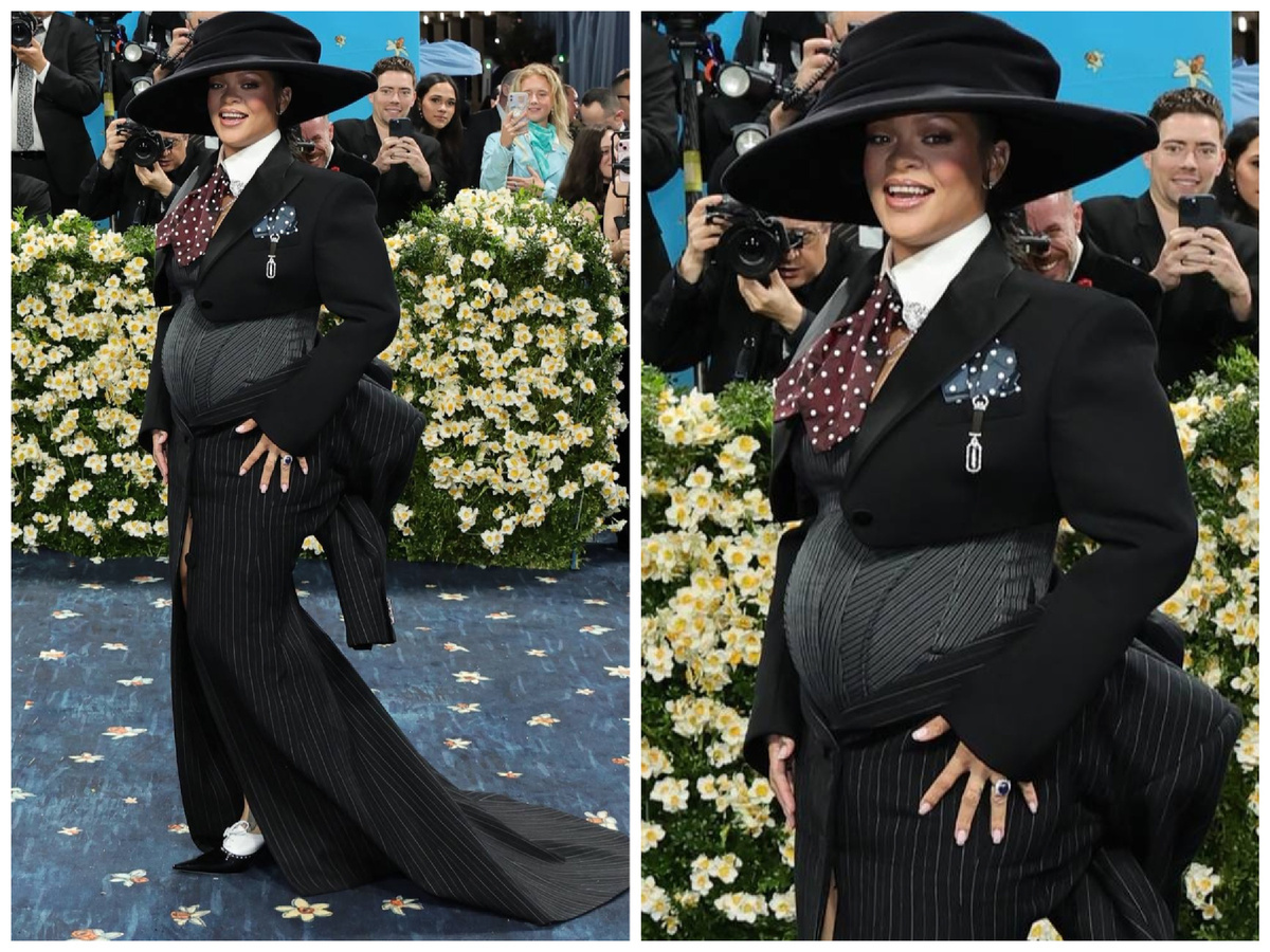 СМИ объявили ее одной из самых хорошо одетых гостей бала, но давайте посмотрим правде в глаза. Костюм спроектирован таким образом , что линии сходят в одну точку, ту, откуда и появляются дети. За основу образа дизайнеры взяли детское развлечение любого советского ребенка: взять папин пиджак и сделать из него платье. Ну и что, что рукава торчат из копчика, зато мы теперь знаем, как выглядит выражение "не пришей козе рукав". Спасибо, Рианна.
