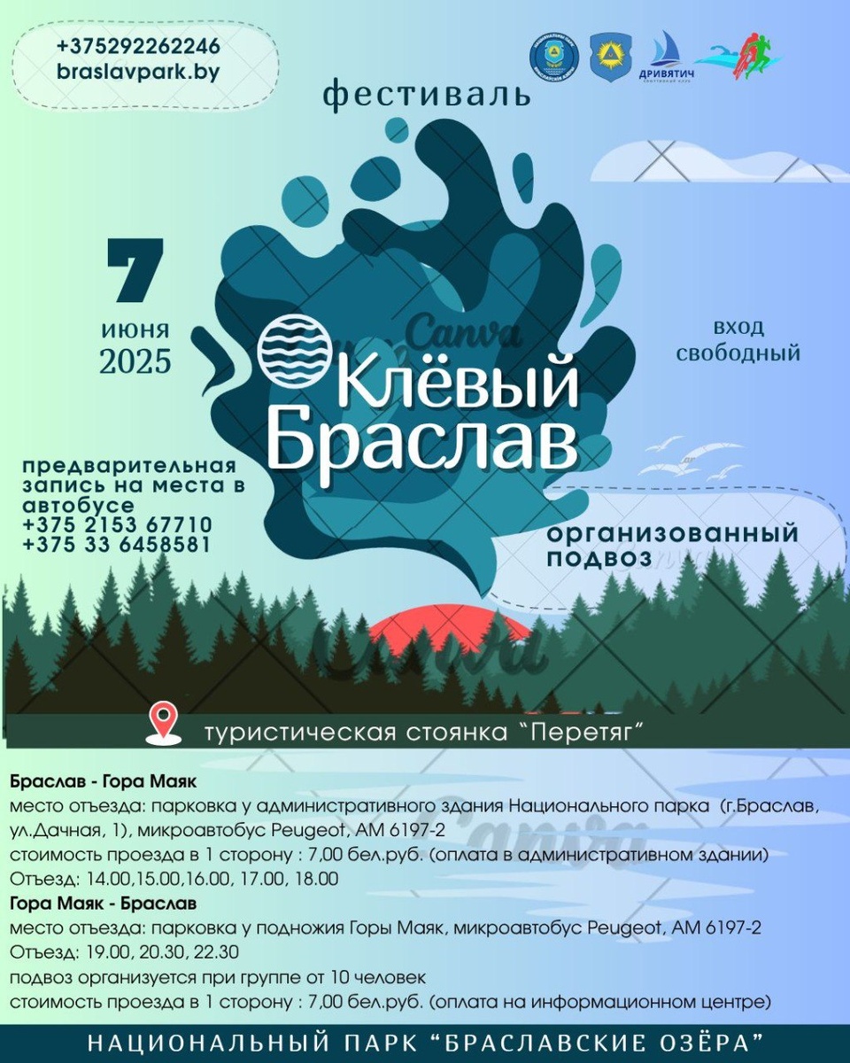 🔥🔥🔥 Программа фестиваля "Клевый Браслав", на 7 июня 2025 ❇️ 7 июня: 12.00 — торжественное открытие Республиканского спортивно-массового мероприятия “Браславский кросс-триатлон” (ОО “Белорусская федерация триатлона”) 12.30 — старт заплыва по оз.Снуды, соревнования по пляжному волейболу в рамках круглогодичной спартакиады среди организаций Браславского района (РФСК “Дривятич”) 15.00 — торжественное открытие фестиваля “Клёвый Браслав” 15.30-17.30 — выступление детских аниматоров с программой “Ловись, рыбка!” 17.30-18.30 — игры и конкурсы с зажигательным ведущим, награждение победителей соревнований 18.30-19.20 — танцуем с кавер-бендом 19.20-20.50 — дискотека с DJ 20.50-21.15 — вас снова зовет ведущий 21.20-22.00 — танцуем с кавер-бендом 22.00 — торжественное закрытие фестиваля ✔️ В течение дня для вас работает: фудкорт, уха, шашлык, полевая кухня прокат лодок, байдарок, квадроциклов, sup-досок прогулки на корабликах водные и экологические экскурсии и многое другое По данным @braslav