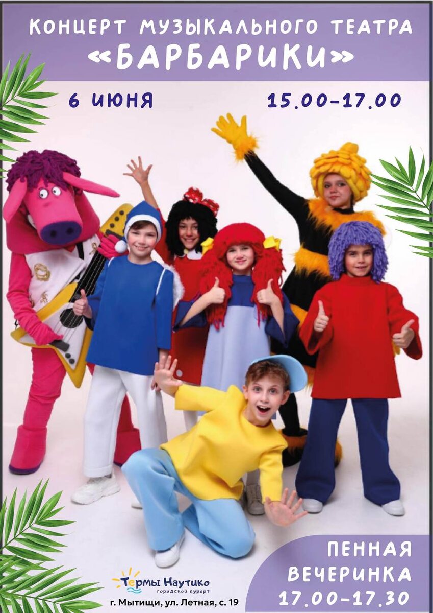 🎉 Дорогие родители! Мы точно знаем, где ваши дети проведут незабываемый вечер в пятницу, 6 июня! Конечно, в термах “Наутико” г. Мытищи! И вы – вместе с ними! 🌟 В этот день к малышам приедут любимые персонажи с планеты Барбарелла! 🌍✨ Добрые человечки Лёлик, малыши Буба, Биби, Баз, Боня и Земная девочка Бьянка из школы Дружбы обещают подарить море улыбок и веселья! 😄💫 С 15:00 до 17:00 в нашем комплексе пройдет яркий концерт знаменитого музыкального театра “Барбарики”! 🎶🎭 А с 17:00 до 17:30 всех ждет волшебная Пенная вечеринка! 💦🎉 Большие и маленькие смогут танцевать, бросать друг в друга воздушные хлопья пены и заряжаться позитивом! 💃🕺 Планируйте заранее - это мероприятие нельзя пропустить! ✨Ведь фото с концерта и пенного веселья останутся с вами навсегда! 🌈🎈