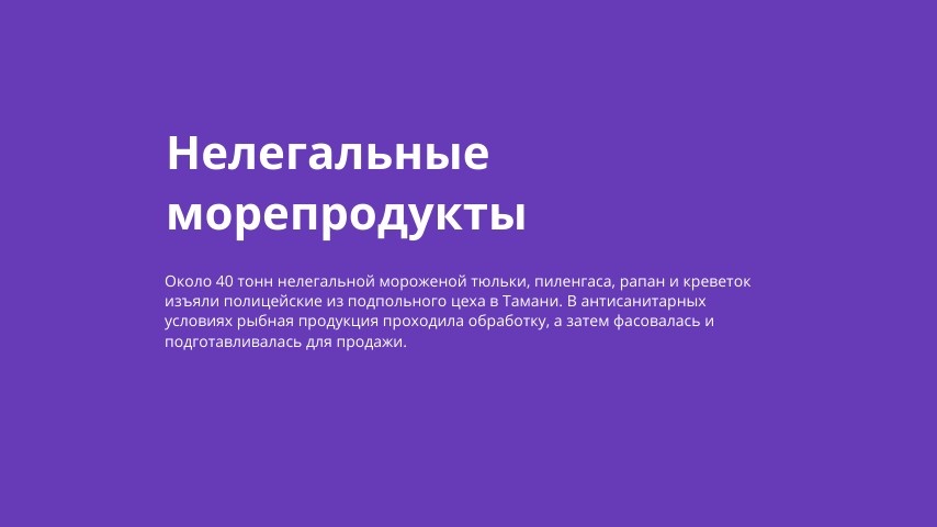 Около 40 тонн нелегальной мороженой тюльки, пиленгаса, рапан и креветок изъяли полицейские из подпольного цеха в Тамани. В антисанитарных условиях рыбная продукция проходила обработку, а затем фасовалась и подготавливалась для продажи. Нелегальный товар, произведенный без соблюдения требований стандартов качества и условий хранения, готовился для продажи в местных торговых точках. В отношении предпринимательницы, которая занималась оптовой торговлей немаркированной продукцией, проводится проверка. Товар помещен на хранение, сообщает ГУ МВД России по Краснодарскому краю. Мероприятие реализовано сотрудники УЭБ и ПК краевого главка полиции совместно с коллегами из регионального управления Росгвардии.