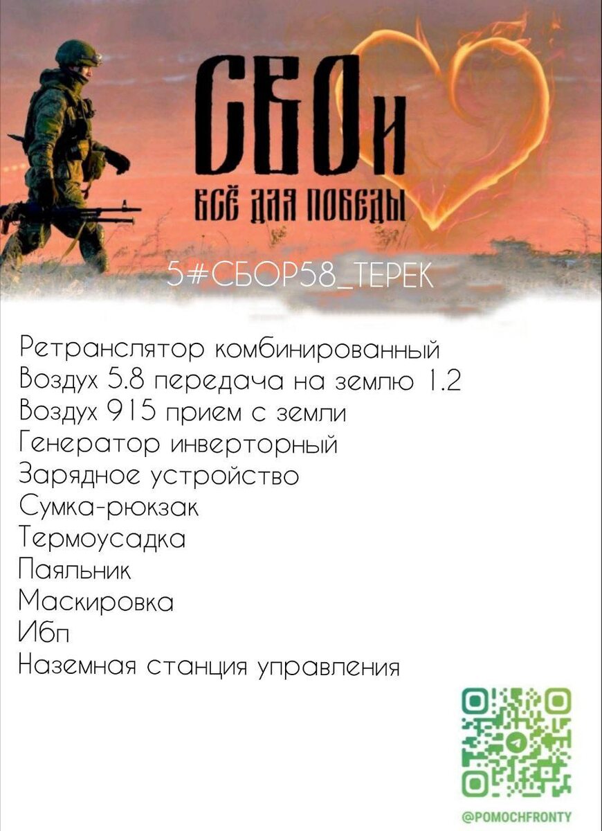 ⚡️😶😶😶😶для ФПВ расчета Терека из группы Мазая Разведка. Парни работают на сложном направлении. Сейчас в группу Мазая добавился еще один ФПВ расчет. Парни просят помощи чтобы расчет мог выполнять поставленные задачи и помогать фронту двигаться вперед. 1. Ретранслятор комбинированный - 44 000 ( чтоб с птички шла трансляция и была дальность полета) 2. Генератор инверторный 21 999р Фея 3. Зарядное устройство 6348 https://ozon.ru/t/J2uDoas 4. Сумка-рюкзак 17 284 для переноса ФПВи комплектующих на бз https://ozon.ru/t/lQIfzoV 5. Термоусадка - 292 https://ozon.ru/t/1WYByjk Фея 6. Паяльник -1420 https://ozon.ru/t/lQIf2rF Фея 7. Маскировка на Старлинк - 1100 https://ozon.ru/t/J2uD9QR 8. Ибп - 3150 https://ozon.ru/t/yt9RFxI Фея 9. Наземная станция управления -15 085 https://ozon.ru/t/teAdbcZ ❗️СУММА СБОРА: 110 678 💳 Реквизиты: Помочь СВОим ФРОНТ Т-Банк: 2200701225452439 Тел. для перевода по СБП (Т-Банк): 89936125765 Юлия Ф./Иван П. 🇷🇺У БОГА НЕТ ДРУГИХ РУК, КРОМЕ НАШИХ🇷?