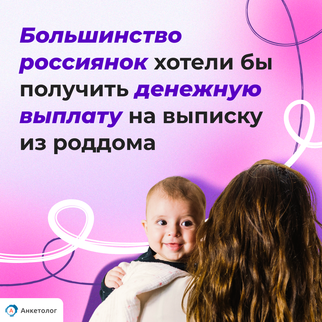 Большинство (75%) опрошенных хотели бы получить в подарок на выписку из роддома единовременную материальную выплату от государства. Больше половины (52%) опрошенных считают, что сумма выплаты должна начинаться от 150 000 рублей, каждая пятая рассматривают сумму от 50 000 до 100 000 рублей, еще 4% от 100 000 до 150 000. Оставшиеся 24% будут рады получить единовременную выплату до 50 000 рублей.