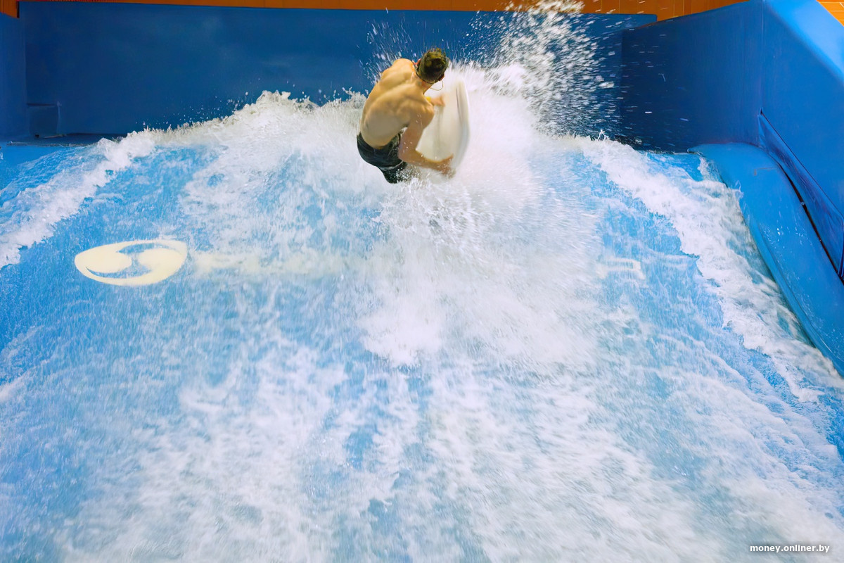 В Беларуси пока есть единственное место, где можно попробовать встать на искусственную волну, — и это аквапарк «Лебяжий» в Минске. Кстати, появился там серф-тренажер довольно давно — еще в 2014 году.