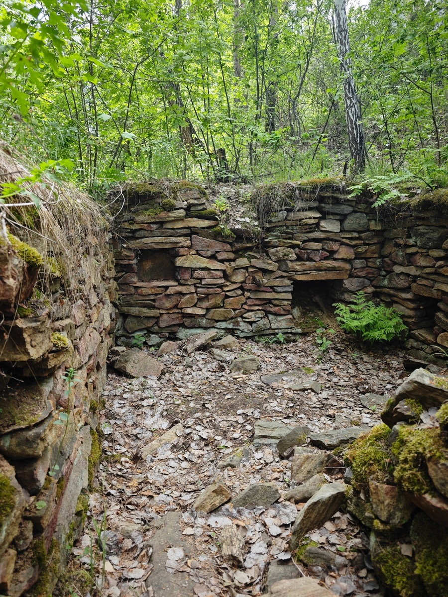 Первые землянки, стены которых выложены камнем, начинают попадаться от точки 55.97255° N, 60.67753° E, рядом находится глубокий каменный колодец.