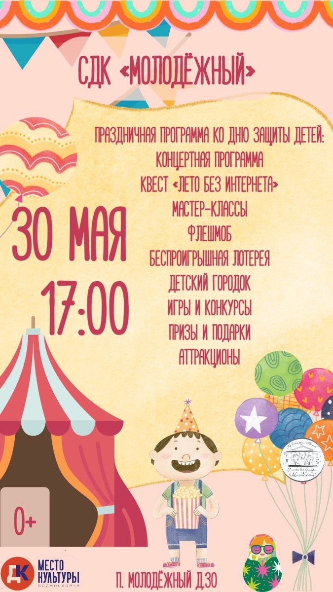 ✨ Программа в посёлке Молодёжный Дню защиты детей ✅ Вас ждут: ✅ Яркая концертная программа ✅ Занимательный квест «Лето без интернета» ✅ Великолепные мастер-классы ✅ Увлекательный флешмоб ✅ Беспроигрышная лотерея ✅ Детский городок ✅ Интересные игры и конкурсы ✅ Замечательные призы и подарки ✅ Динамичные аттракционы 🚫 Возраст: 0+ 📆 30.05.2025 🕒 17:00 🏢 СДК «Молодежный» 📍 г.о. Подольск, пос. Молодёжный, д.30 💰 Вход свободный❗️ #webПодольск ⭐Разместить публикацию ⭐Поддержать канал голосом ✅ Мероприятия Подольск https://dzen.ru/id/66ed500f7b5671493eca3fd6 http://vk.com/podolsk_events http://dzen.ru/podolsk_events