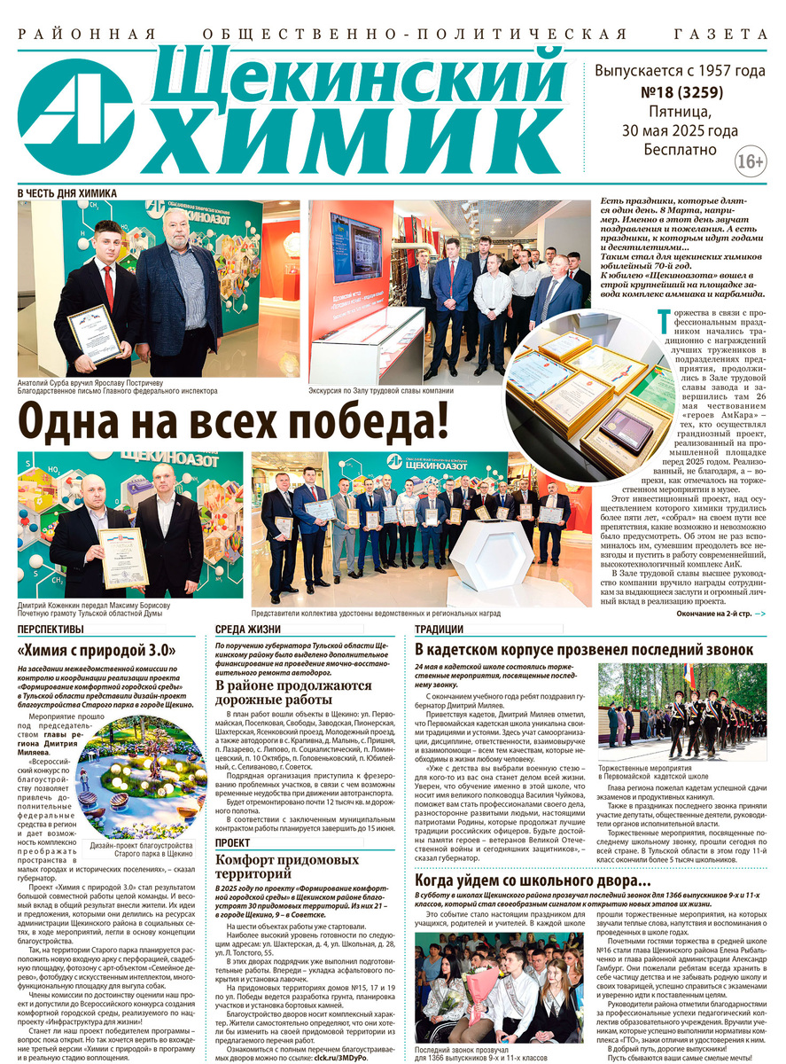Только у нас – эксклюзивная информация о предприятии, тружениках, отличившихся щекинцах. Планы развития промплощадки, муниципалитета, реализованные и реализуемые проекты, достижения в сферах спорта, культуры, экономики, образования… Все эти вопросы – в зоне нашего внимания! Встречайте «ЩХ», читайте, сохраняйте! Темы выпуска от 30 мая 2025 года: – Герои и победы «Азота»! И снова – триумф химиков! – Проект «Химия с природой 3.0»: быть или не быть? – Где идет ремонт дорог? – Славные юбилеи-2025: ЩПК – 70 лет! – Владимир Лебедев: прошлое – это мост в будущее! – «Услада»! Услада для слуха и глаз! – Как прошел детский праздник от «Азота» в Первомайском парке? – ТВ-программа/Вакансии компании «Щекиноазот». Получайте «ЩХ» в точках выкладки (адреса – в комментариях). Распространяется газета бесплатно! Есть новости? Редакция – на связи: +7(48751) 9-28-98, konik@azot.net.