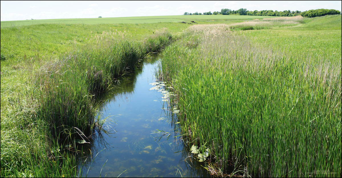 Поле, солнце, жара и мостик, через "ручей", о котором на подъезде к нему были мысли - только где его переехать - переправу на карте разыскать. Но за мостиком руки сами нажимают на тормоза, и велик остается чуть за ним, а глаза уже над маленькой речушкой пологого поля, завороженные листьями растений, что корнями держат ее дно. Чистая вода и все в ней видно, и травы по берегам напоены и радостны, и дальше и дальше в поле уходит зелень, где-то рядом чуя реку влажностью земли от близости к воде.