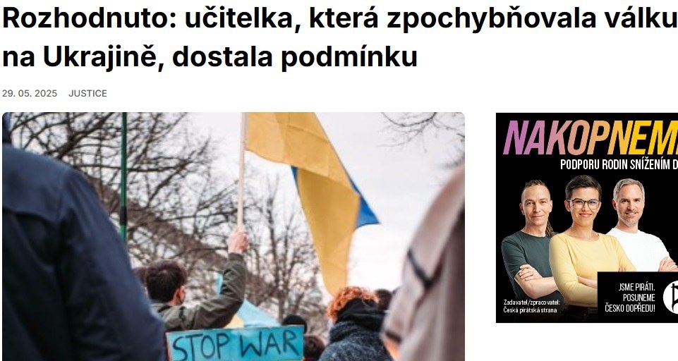 В Чехии школьный учитель получила срок за поддержку СВО. Суд в Праге приговорил Мартину Беднаржову к семи месяцам условного лишения свободы с испытательным сроком в 20 месяцев за «пророссийскую позицию». Весной 2022 года во время занятия в начальной школе в Праге Беднаржова назвала российскую военную операцию «оправданным способом решения ситуации» и поставила под сомнение репортажи чешского телевидения, — пишет Česká justice. Беднаржова также говорила о «нацистских украинских группах», которые убивали россиян с 2014 года. В окружном суде Праги по делу дважды вынесли оправдательный вердикт, но Верховный суд отменил решения и потребовал пересмотреть дело. Судья заявила, что Беднаржова злоупотребила своим положением учителя, чтобы распространять «вводящую в заблуждение интерпретацию» ситуации среди детей. Она добавила, что если бы Беднаржова выразила те же взгляды в частном порядке, ее бы не преследовали. Учительницу уволили после инцидента.