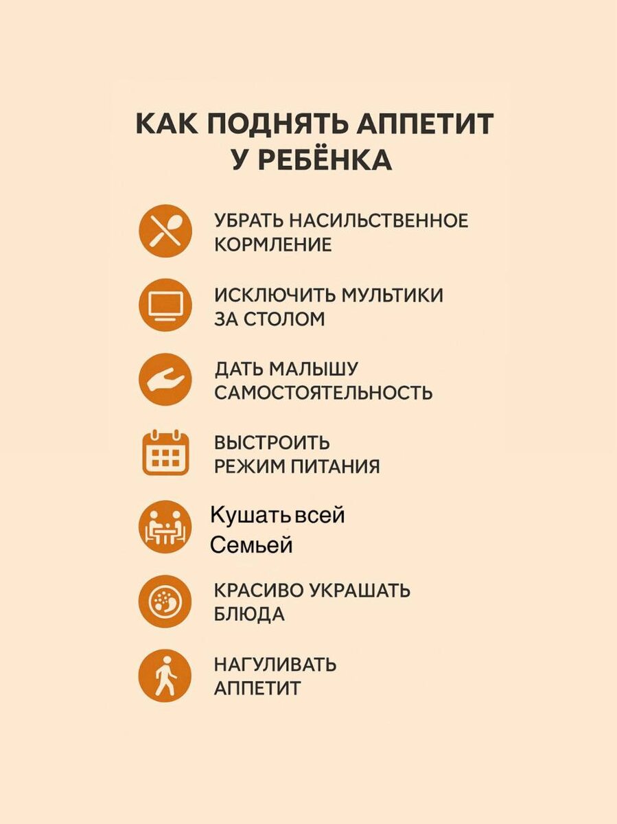 Поднимаем аппетит у малыша ➖➖➖➖➖➖ ⬇️Сначала разберёмся, почему ребёнок может есть мало: ⏺️Медицинские причины — малыш болеет, режутся зубки, анемия и т.д. В этом случае — только к врачу! ⏺️Неприязнь к блюду — не нравится вкус, запах, консистенция, подача. Если ребёнок не хочет есть кабачок — не стоит настаивать, пользы от этого не будет. ⏺️Организация питания — ребёнок привык есть под телевизор/планшет. Сюда же относятся постоянные перекусы. ⏺️Негативный опыт — например, малыш подавился и теперь боится есть. ⏺️Периодические “малоежки” — бывают периоды, когда ребёнок сам по себе начинает есть меньше без видимых причин. Не переживать, если аппетит быстро восстанавливается . ❗️Когда НЕ стоит переживать за аппетит, а просто поддерживать интерес к еде: ✔️Ребёнок ест более 15-20 разных продуктов (не за раз, конечно!) — в том числе мясо, каши, молочные продукты. ✔️Соглашается поесть при уговорах. ✔️Иногда пробует что-то новое. ✔️Ест с общего стола родителей. 🏥Когда стоит обратиться к в