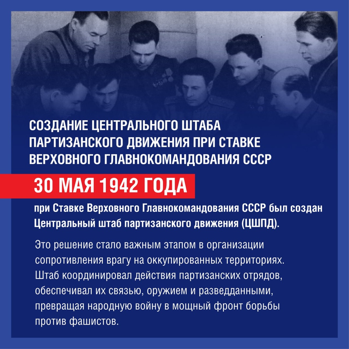 Создание Центрального штаба партизанского движения при Ставке Верховного Главнокомандования СССР 30 мая 1942 года при Ставке Верховного Главнокомандования СССР был создан Центральный штаб партизанского движения (ЦШПД). Это решение стало важным этапом в организации сопротивления врагу на оккупированных территориях. Штаб координировал действия партизанских отрядов, обеспечивал их связью, оружием и разведданными, превращая народную войну в мощный фронт борьбы против фашистов. Под руководством Пантелеймона Пономаренко ЦШПД разрабатывал стратегии диверсий, проводил масштабные операции на коммуникациях противника и помогал Красной Армии в освобождении захваченных земель. Партизаны уничтожали вражеские эшелоны, мосты и склады, сеяли панику в тылу врага, демонстрируя несгибаемую волю советского народа к победе. Создание ЦШПД показало, что даже в самых тяжелых условиях народ способен дать отпор захватчикам. Сегодня мы чтим память героев-партизан, чьи подвиги стали неотъемлемой частью Великой