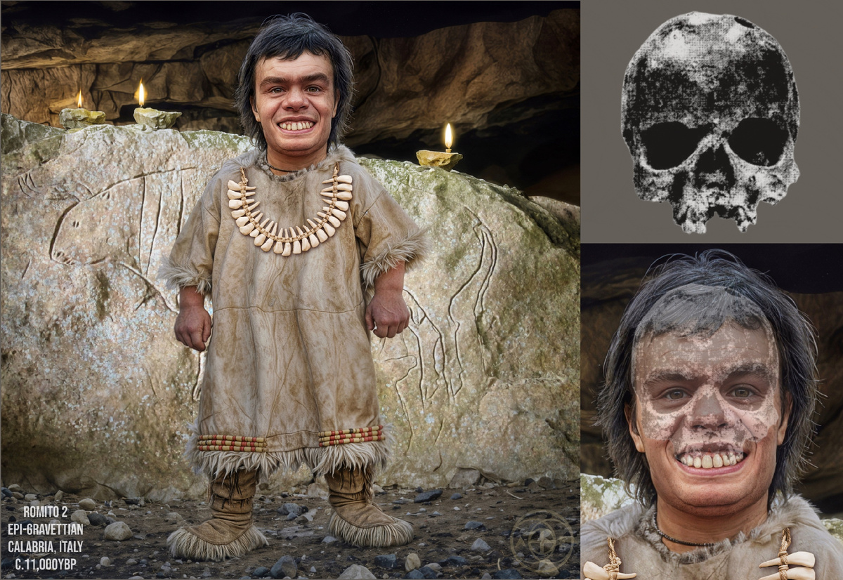 Пещеру Ромито обнаружили на юге Италии весной 1961 года, и год спустя в ней начались раскопки. Место знаменито наскальными гравировками быков, а также находками костей древних людей. Археологами были обнаружены многочисленные каменные орудия, в том числе из обсидиана, а также большое количество угля. Судя по наличию керамических черепков в верхних слоях, пещера населялась в течение тысяч лет, от палеолита до конца неолита. Во время первых исследований были раскопаны 3 могилы, относящиеся к верхнему палеолиту (эпиграветт), каждая с парным захоронением. Скелеты обозначили Ромито 1-6. Биологический возраст погребенных 15-25 лет, все были невысокого роста, не более 1,5 м. Но один скелет, Ромито 2, выделялся на фоне остальных: судя по крайне маленьким размерам конечностей, это самый древний известный ученым случай карликовости. Возраст погребения не менее 11 тысяч лет. Скелет демонстрирует особенности, типичные для акромезомелической дисплазии. Рост был очень низким, 110-120 см, предплечья