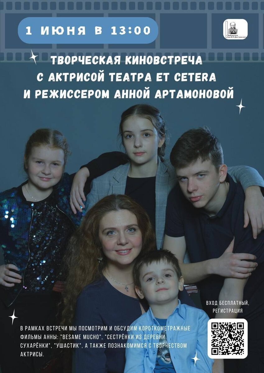 🆓Творческая киновстреча с актрисой театра Et Cetera и режиссером Анной Артамоновой 🗓️1 июня, 13:00 📍библиотека имени Ф.М.Достоевского, Чистопрудный бульвар, 23с1 В рамках встречи мы посмотрим и обсудим короткометражные фильмы Анны: «Besame mucho», «Сестрёнки из деревни Сухарёнки», «Ушастик», а также познакомимся с творчеством актрисы — она споет песни и прочитает отрывки из близких сердцу произведений. Это будет настоящая семейная программа, интересная и взрослым, и детям! Кроме того, на встрече сможем узнать интересные факты о творческой и личной жизни актрисы, задать ей свои вопросы. Анна Артамонова — актриса театра Et Cetera под руководством Александра Калягина, режиссёр театра и кино, сценарист, автор стихов и песен, слушатель Академии Никиты Михалкова. И при этом мать четверых детей. Организаторы мероприятия – Центр кинопедагогики и медиакультуры МПГУ совместно с Комиссией Союза кинематографистов России "Творческая Лаборатория духовно-нравственного и просветительского кино