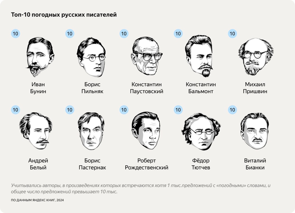Исследование Яндекса: как описывали погоду русские классики По данным исследования, чаще всего о погоде писал Иван Бунин, самый «солнечный» писатель — Михаил Пришвин Представители русской литературы, описывая погодные явления, чаще всего говорили о ветре. Следом по популярности идут небо, солнце, снег, дождь. Все эти слова хотя бы раз встречаются в произведениях большинства писателей. Также в топ популярных существительных вошли: воздух, туман, мороз и туча. Каждый из изученных авторов хотя бы раз упоминал погоду, но некоторые писали о ней чаще. По данным Яндекс Книг, самым «погодным» оказался Иван Бунин, на втором месте — Борис Пильняк, на третьем — Константин Паустовский. Описания жары чаще встречается у Ивана Бунина и Валентина Распутина, а холодной погоды — у Михаила Пришвина и Варлама Шаламова. О тумане и ненастной погоде чаще писали Александр Блок, Михаил Лермонтов и Константин Бальмонт, а солнечный день чаще можно встретить в текстах Михаила Пришвина и Аркадия Аверченко. Не