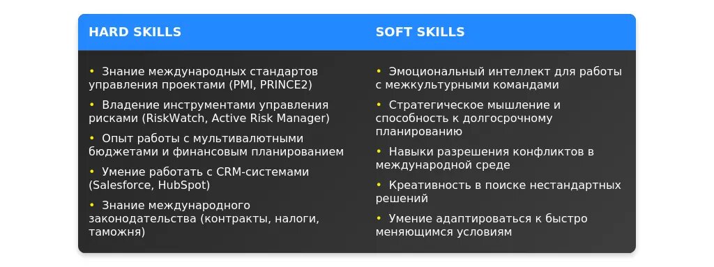 После адаптации: "Управление международными проектами, знание Agile-методологий, английский язык (Advanced), опыт работы с CRM."