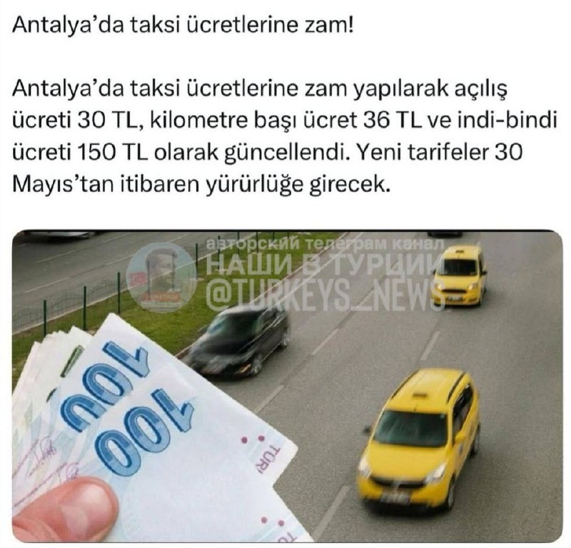 🇹🇷 В АНТАЛЬЕ ПОВЫШАЮТ ЦЕНЫ НА ТАКСИ С 30 мая в Анталье вступают в силу новые тарифы на такси: – посадка — 30 лир – каждый километр — 36 лир – минимальная короткая поездка (посадка + высадка) — 150 лир Изменения связаны с ростом расходов на обслуживание транспорта и инфляцией. Жители и туристы готовятся к подорожанию привычных маршрутов. 📌 Подписывайся на TurkeyNews Следим за новостями Турции