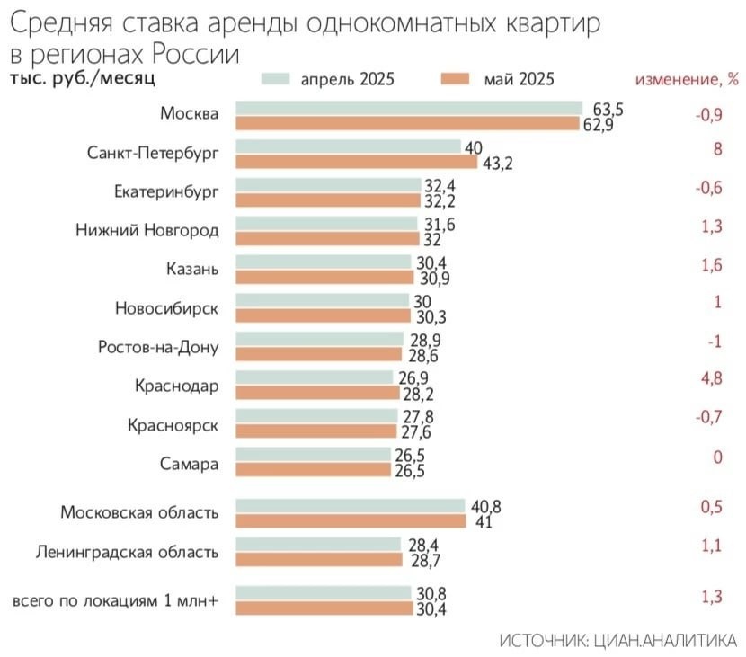 Средняя цена аренды однушки по стране — 30 800 ₽ (+1,3% за месяц). Для сравнения: в апреле рост был почти нулевым (+0,1%). • В городах-миллионниках, по данным «Мира квартир», рост составил 2% (до 37 226 ₽), в «Этажах» — до 1,5%. Только «Яндекс аренда» пока фиксирует снижение — медианная ставка упала на 0,6% (до 34 000 ₽). ⇒ Лидеры роста: • Санкт-Петербург: 43 200 ₽ за однушку (+8%) • Пермь, Волгоград, Воронеж: рост 4–6%