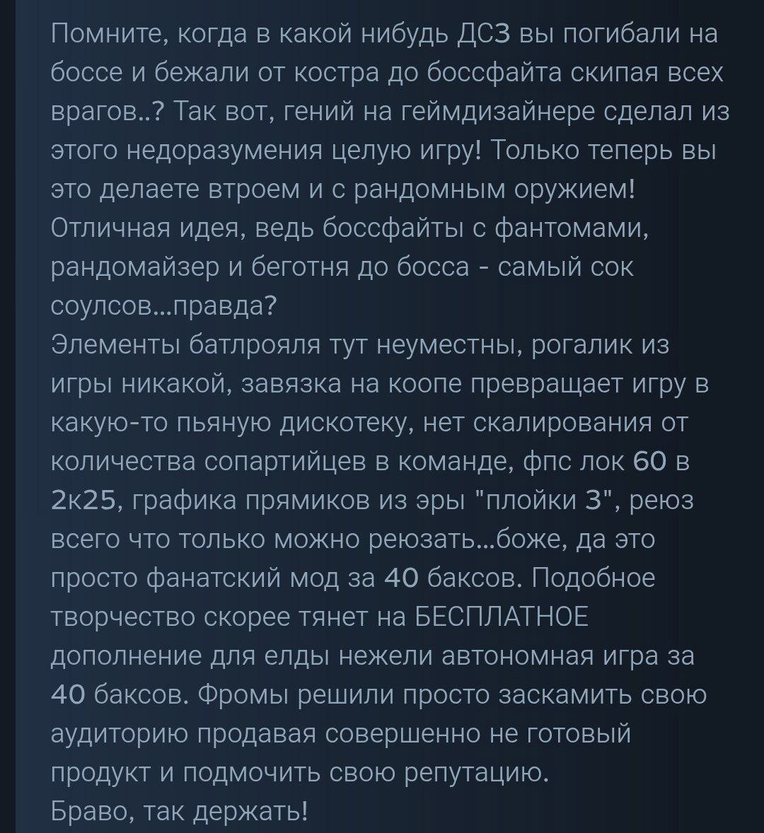 🔥 Elden Ring Nightreign: Резонансный релиз — шедевр или провал? Кооперативный роглайк от FromSoftware собрал 313 593 пиковых игрока в Steam, но разделил комьюнити. Вот что вызывает самые жаркие споры: ⚔️ Главные претензии: - «Пустой мир»: минимум лора, однотипные забеги - Жёсткий дисбаланс: соло-прохождение невозможно, дуэты не поддерживаются - Нет кроссплея и встроенного чата (даже текстового) - Одна карта без вариативности 🎮 Кому может зайти? ▸ Фанатам хардкорного коопа с друзьями (именно втроём!) ▸ Тем, кто хочет механически отточить скиллы в духе Souls ▸ Охотникам за эндгейм-контентом без нарратива 💬 Мнения игроков: «Это DLC для тех, кто прошёл Elden Ring 20 раз и хочет ещё боли» «FromSoftware сделала Dark Souls 2: Electric Boogaloo» P.S. Уже пробовали? Стоит ли игра 2849 ₽? Делитесь впечатлениями! 💀