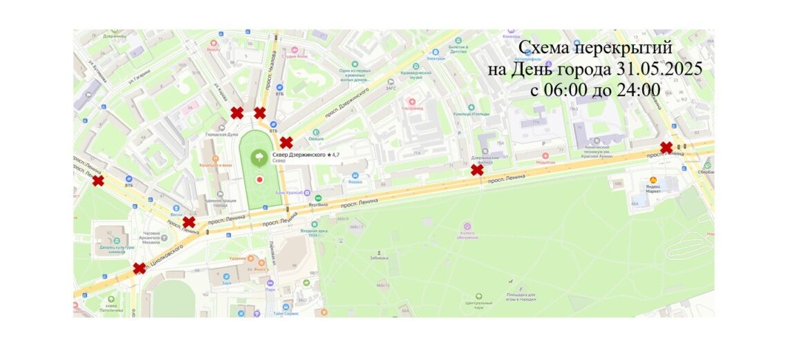 В связи с проведением общегородских праздничных мероприятий, посвященных Дню города, 31 мая 2025 года с 06:00 до 24:00 будет перекрыт подъезд к площади Дзержинского. Изменение маршрутов общественного транспорта в указанные дни: Автобусный маршрут № 2 Ул. Урицкого — пр. Циолковского — ул. Грибоедова — пр. Ленина — ул. Самохвалова — Город Наук — пр. Ленинского Комсомола — пр. Ленина — ул. Грибоедова — пр. Циолковского — ул. Урицкого (без заезда на пл. Дзержинского). Автобусный маршрут № 5 Прямое направление: пр. Ленина — ул. Грибоедова — пл. Ленина — ул. Маяковского — пл. Маяковского — ул. Клюквина — пр. Ленина — далее по маршруту следования. Обратное направление: пр. Ленина — ул. Клюквина — пл. Маяковского — ул. Маяковского — пл. Ленина — ул. Грибоедова — пр. Ленина — далее по маршруту следования. Автобусные маршруты № 9, 104 Ул. Урицкого — пр. Циолковского — ул. Грибоедова — пр. Ленина — далее по маршруту следования. Автобусный маршрут № 25 Пр. Ленина — ул. Грибоедова — пр. Циолковског