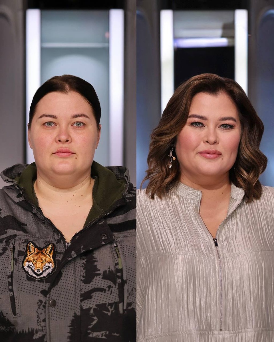 Продолжаем рубрику «Разбор образов из Модного приговора» с комментариями! Начнем с первого образа, в котором девушку одели в светлый костюм. Что вы замечаете? Для меня первое, что бросается в глаза - она выглядит на несколько размеров больше, чем в любом другом образе, даже в том, в котором она пришла в студию. Почему так происходит? Это связано с объемами самого костюма, светлым цветом и спущенной линией рукава, которые визуально увеличивают верх. Несмотря на то, что костюм в одном цвете должен создавать единую вертикальную линию, светлый оттенок подчеркивает, где заканчивается верхняя часть, что режет фигуру пополам в не самом удачном месте. В результате ноги выглядят короче, а фигура шире. Второй образ выглядит намного симпатичнее, но драные драматичные фактуры совершенно не подходят к чертам лица этой героини. Если бы образ был без трендовых дыр, он смотрелся бы гораздо лучше. Тренды - это хорошо, но выбирать среди трендов нужно то, что украшает конкретного человека! У нее очень ми