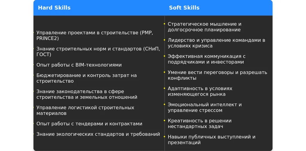 - Какие ключевые навыки стоит выделить для позиции директора строительной компании, подкрепляя их фактами.