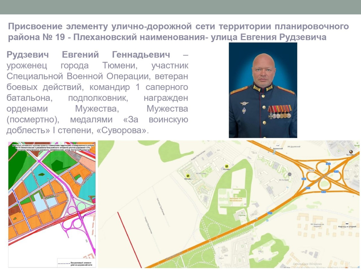 Новые улицы Тюмени расскажут о современных героях На очередном заседании комиссии по присвоению, изменению, аннулированию наименований элементов планировочной структуры и элементов улично-дорожной сети в границах города Тюмени рассматривалось предложение о присвоении безымянной улице имени Евгения Геннадьевича Рудзевича — участника специальной военной операции, ветерана боевых действий, командира 1-го саперного батальона, подполковника, награжденного двумя орденами Мужества, медалями «За воинскую доблесть» I степени, «Суворова». Предложение поступило от войсковой части № 56602 Минобороны РФ. Начальник штаба батальона нашего героя поделился, что его поддержали и другие армейские части, с которыми непосредственно взаимодействовало подразделение: - Я служил с Евгением Геннадьевичем с 1999 года в Волгограде, потом наши пути разошлись: я перешёл в МЧС, он остался в армии. Встретились мы в октябре 2022 года во время мобилизации, а в ноябре уже вместе служили в ДНР на Авдеевском направлен