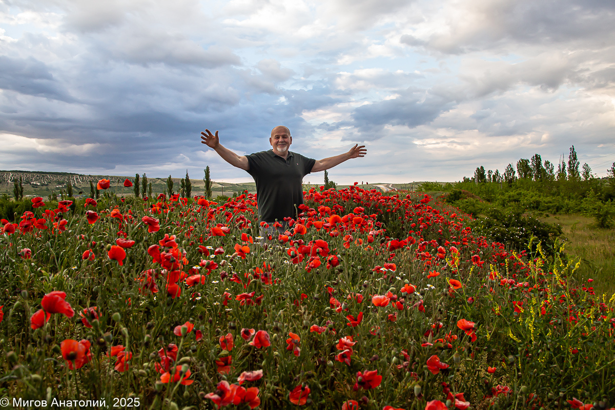 Было время, когда мы только переехали в Крым, маки росли практически в шаговой доступности от нашего дома. Огромное поле на краю нашего городка Старый Крым, на котором в середине мая цвели красные маки, фиолетовые дельфиниумы и белые ромашки. Проезжающий мимо народ останавливался для фотосессии на цветущем поле. Но потом это замечательное поле перепахали. Теперь тут цветут сады и растет виноград. А в поисках цветущих маков мы теперь садимся на машину и отправляемся по проселочным дорогам, куда глаза глядят. Всегда что-нибудь находим. Маки, они неистребимы. В одном месте проедет по ним трактор, перевернёт плугом всю землю, так они на другой год уже цветут где-то неподалёку. Вчера позвонил Игорь - новый старокрымчанин, переехавший в наш городок из Москвы два года назад. Говорит, что видел отличное поле цветущих маков неподалёку от села Холодовка. Прислал мне фото. Мы с Игорем знакомы больше года. Он, кстати, купил в Старом Крыму дом, который мы смотрели ещё в 2013 году. Это домовладение