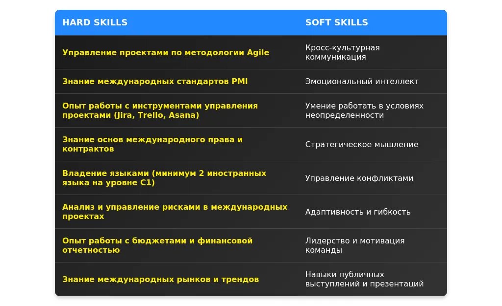 - На какие навыки делать акцент: Базовые навыки управления проектами, владение инструментами, языковые навыки.