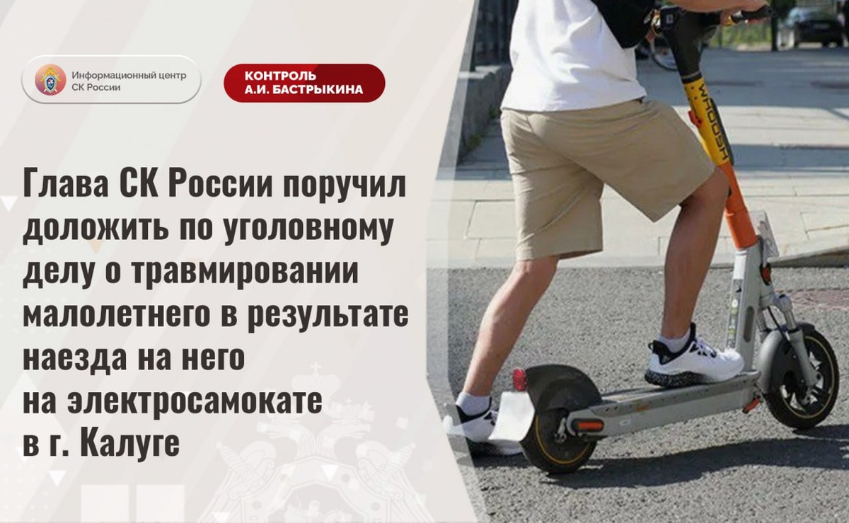 Глава СК России поручил доложить по уголовному делу о травмировании малолетнего в результате наезда на него на электросамокате в г. Калуге В СУ СК России по Калужской области возбуждено уголовное дело по факту травмирования шестилетнего мальчика в результате наезда на него на электросамокате в городе Калуге. По данным следствия, 28 мая текущего года водитель средства индивидуальной мобильности сбил ребенка в пешеходной зоне, после чего скрылся с места происшествия. Пострадавшему потребовалась медицинская помощь. Ситуация освещается в социальных сетях и СМИ. Председатель Следственного комитета Российской Федерации Александр Иванович Бастрыкин поручил руководителю СУ СК России по Калужской области Марку Сергеевичу Харламову доложить о предварительных и окончательных результатах расследования уголовного дела. Исполнение поручения поставлено на контроль в центральном аппарате ведомства. #СледственныйКомитет #СКРоссии #СКР #ИЦСКР #ИнформационныйЦентр #АлександрБастрыкин #ПредседательСКР #К