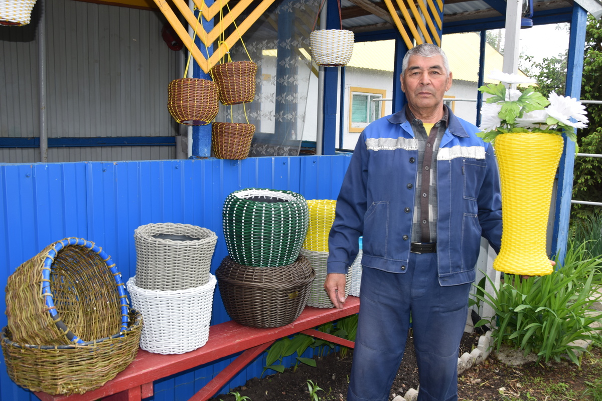 С Ильфатом Галеевичем Мрясовым мы познакомились во время творческого визита в ООО «Дружба». 72-летний пенсионер вышел на поддержку хозяйства и по просьбе руководителя выполнял работу по механическому дроблению зернофуража. - Я уходил на заслуженный отдых с этого хозяйства, но оставлять любимое дело не получается, да и не хочу, - говорит Ильфат Галеевич. - Пока есть силы и здоровье, приятно вносить свой вклад в общее дело. Во время беседы с опытным тружеником села выяснилось, что он ещё настоящий мастер по лозоплетению. Эту тему мы никак не могли обойти стороной, и наше журналистское любопытство привело нас в д. Саитовский. Дом Ильфата Мрясова найти не сложно: ворота украшают фигурки пары лебедей, а недалеко на дереве сооружено гнездо с аистом. Сразу понятно, в этом доме проживает мастер с творческой душой. Ильфат Галеевич несколько лет делает всевозможные бытовые предметы из ивовых прутьев: вазы, корзины, интерьерные аксессуары, посуду и другую утварь. Со временем увлёкся другим видом