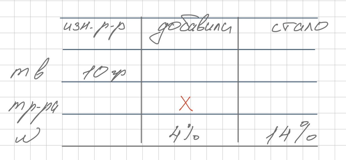 Определите какую массу 4% раствора соли нужно добавить к 10 граммам этой же соли, чтобы ее массовая доля в растворе составила 14%? Сначала составим таблицу и заполним данные. Так как изначальный раствор состоял только из 10 грамм чистой соли , то масса раствора тут тоже 10гр, тк это все возможное вещество. Массу вещества в добавляемом растворе мы выразим из массы раствора ( которую нас просят найти) и массовой доли. Теперь можем выразить величины нового раствора, сложив величины в первых двух столбиках. Нас интересует 14% раствор, поэтому уравнение мы составляем по последнему столбику, просто подставляя наши данные в формулу массовой доли: Рассчитайте массу воды, которую необходимо выпарить из 150 грамм 3% раствора, чтоб массовая доля вещества в растворе составила 10%? Так как в этой задаче нас спрашивают про воду, значит ее мы и обозначим за х. Так как меняется у нас только наличие воды, то масса вещества у нас остается в исходном виде: А теперь по последней колонке собираем ур
