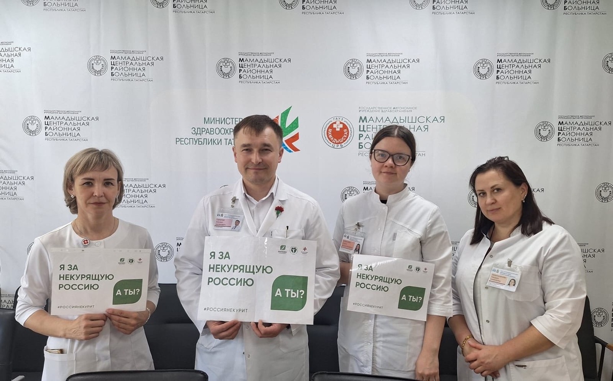 Мамадышская ЦРБ поддержала акцию «Освободим Россию от табачного дыма!» -- 31 мая в рамках Всемирного дня без табака по всей стране проходит акция «Освободим Россию от табачного дыма!», организованная Российским обществом профилактики неинфекционных заболеваний (РОПНИЗ) и ФГБУ «НМИЦ ТПМ» Минздрава России. Активное участие в этой важной инициативе приняли главный врач ГАУЗ «Мамадышская центральная районная больница» Руслан Загирович Гарипов и сотрудники медучреждения. Медики не только поддержали всероссийскую кампанию, но и показали своим примером: быть здоровым — это современно, разумно и достойно подражания. Главная цель акции — защита подрастающего поколения от пагубного влияния табака, а также повышение информированности населения о вреде курения и его последствиях. Врачи Мамадышской ЦРБ напоминают: никотиновая зависимость опасна для здоровья и может стать причиной множества заболеваний, включая рак лёгких, хроническую обструктивную болезнь лёгких (Х Показать полностью... ✅ ПОДПИС