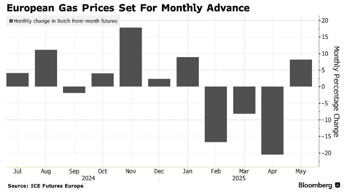 Европейский газ ожидает месячного прироста на фоне ухудшения перспектив поставок Цены на природный газ в Европе готовятся к первому месячному росту с января, что связано с рядом геополитических событий и признаков ужесточения рынка. Фьючерсы на ближайший месяц по бенчмаркам указывают на ожидаемый ежемесячный рост примерно на 8%, даже несмотря на то, что июльский контракт в пятницу торговался немного ниже. В апреле контракты потеряли более 20% из-за экономических опасений, вызванных торговой войной под руководством США. С тех пор перспективы торговых тарифов президента США Дональда Трампа стали более неопределёнными, а вероятность возвращения российских газовых потоков в ближайшее время стала ещё меньше. Усилия по прекращению конфликта на Украине пока не привели к значимым результатам. Внутри страны Европа усилила контроль за российским газом, разработав план поэтапного отказа от ископаемого топлива из Москвы, а Германия укрепила свою позицию против возобновления работы трубопровода «Се