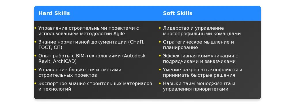 После: "Управление строительными проектами, знание СНиП и ГОСТ, опыт работы с подрядчиками и контроля качества."