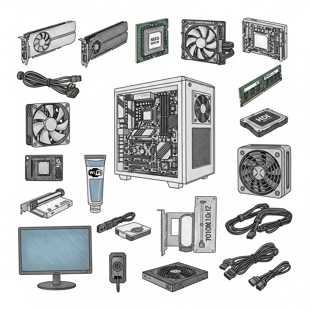 Все компоненты взаимодействуют для обеспечения работы компьютера. Процессор выполняет вычисления, материнская плата связывает его с другими деталями, оперативная память ускоряет доступ к данным, видеокарта обрабатывает графику, накопитель хранит информацию, блок питания обеспечивает энергию, корпус защищает систему, а охлаждение предотвращает перегрев. Дополнительные компоненты, такие как звуковая карта, сетевой адаптер, оптический привод или вентиляторы, добавляют удобства или улучшают производительность в зависимости от твоих потребностей.