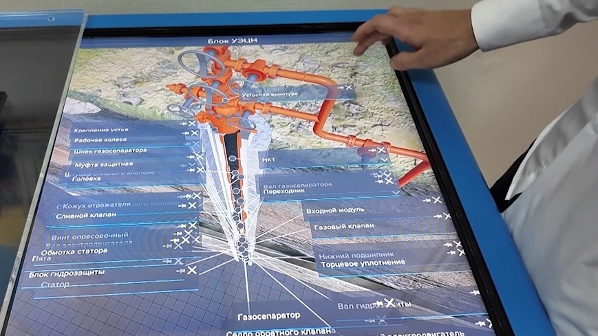 На этом устройстве студенты наглядно видят, как происходит добыча, через какие пласты подаются углеводороды на станцию перекачки. Интерактивная доска показывает работу погружных электроцентробежных насосов для откачки из скважин жидкостей и примесей.