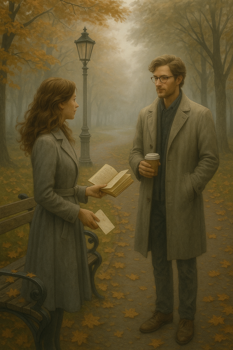Она обернулась. В нескольких метрах стоял мужчина. Высокий, в светло-сером пальто. В одной руке - книга, в другой - чашка кофе. Лицо… слишком знакомое. Как будто взятое из снов. Или из старых писем, запах которых до сих пор хранился в памяти.