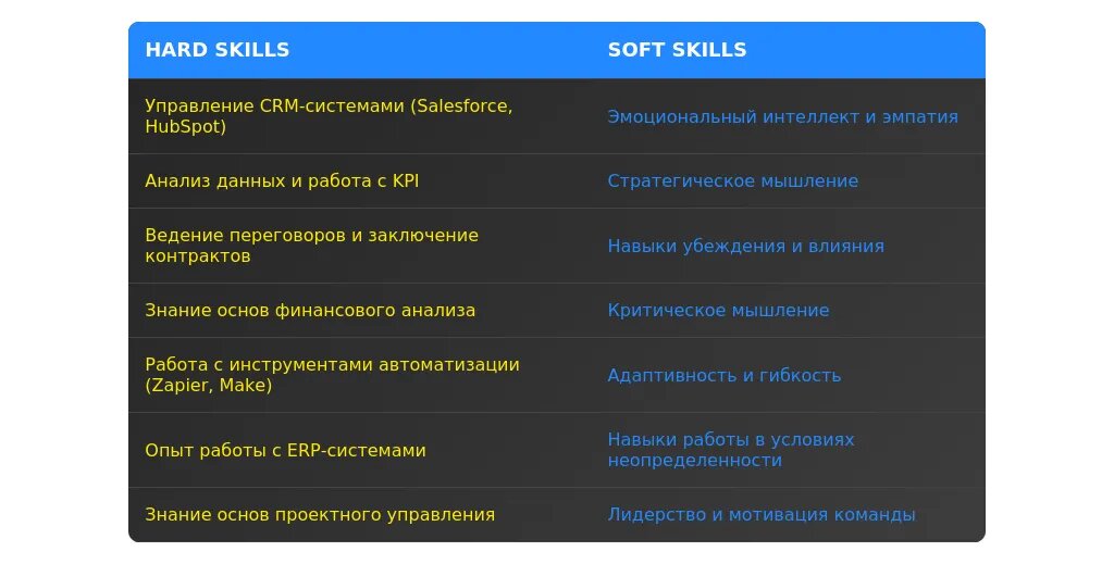 После адаптации: "Владение CRM-системами (Salesforce, Bitrix24), навыки ведения переговоров и работы с возражениями."